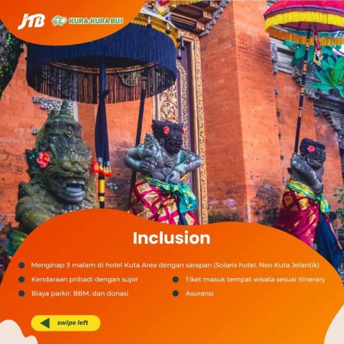 - Menginap 3 malam di hotel Kuta Area dengan sarapan (Solaris hotel, Neo Kuta Jelantik)