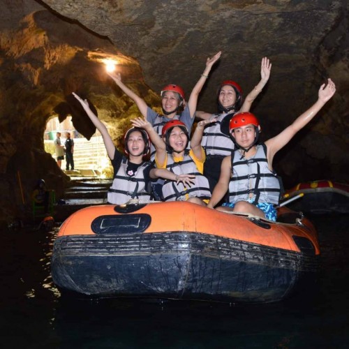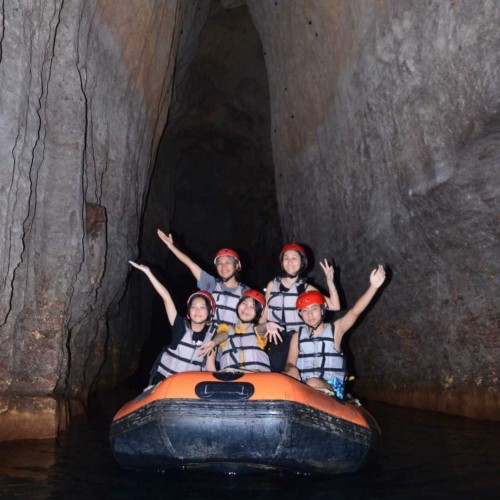 Wisata penelusuran goa menggunakan perahu karet dengan pemandu wisata menceritakan sejarah goa tanding. Jarak tempuh dari start sampai finish 900 meter dengan durasi 45 menit